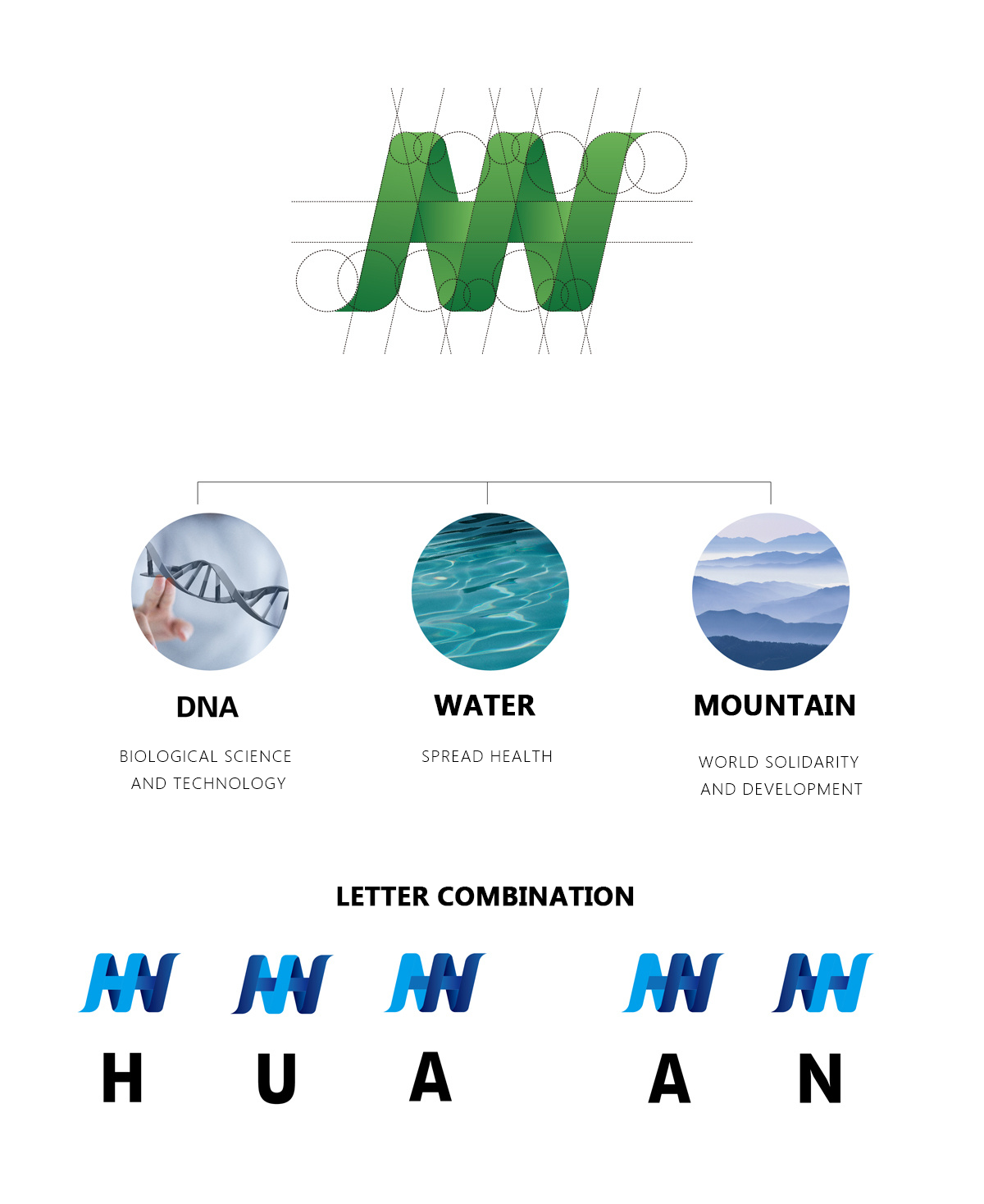 DNA represents biological technology; water wave represents information flow; mountains represent the connection of all places of the world and united development.